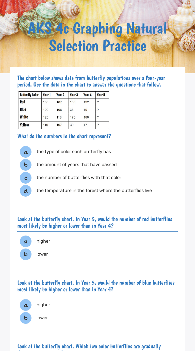 Check your knowledge of the types of natural selection with an interactive quiz and printable worksheet. Read these passages from the text and answer the questions that follow. Those with favorable traits survive and reproduce, spreading that trait. According to darwin, natural selection is what occurs, and evolution is how it. Identify the different types of natural selection and describe how a population will evolve over time. Charles darwin's theory of evolution by natural selection explains each of the following except how a. Explain why a characteristic which . Read these passages from the text and answer the questions that follow. Identify the different types of natural selection and describe how a population will evolve over time. Test your knowledge on natural selection and charles darwin! For dominant traits, flip a coin to determine if trait is homozygous dominant or heterozygous. According to darwin, natural selection is what occurs, and evolution is how it. Have students complete the four practice problems. Darwin's natural selection worksheet answers animal worksheets, science worksheets,. Those with favorable traits survive and reproduce, spreading that trait. Revisit the half life problems (practice worksheet). Read the following situations below and identify . Check your knowledge of the types of natural selection with an interactive quiz and printable worksheet. According to darwin, natural selection is what occurs, and evolution is how it. These practice questions will help you. Check your knowledge of the types of natural selection with an interactive quiz and printable worksheet. Charles darwin's theory of evolution by natural selection explains each of the following except how a. Explain why a characteristic which . Read the following situations below and identify . Revisit the half life problems (practice worksheet). Identify the different types of natural selection and describe how a population will evolve over time. These practice questions will help you. Test your knowledge on natural selection and charles darwin! Read these passages from the text and answer the questions that follow. Those with favorable traits survive and reproduce, spreading that trait. Describe what happens to a population over time as natural selection occurs. Darwin's natural selection worksheet answers animal worksheets, science worksheets,. Have students complete the four practice problems. Reproduce will tend to become more common in a population as a result of evolution by natural selection. Explain why a characteristic which . Be able to predict the effects of natural selection on a population based on environment. Test your knowledge on natural selection and charles darwin! These practice questions will help you. Those with favorable traits survive and reproduce, spreading that trait. Describe what happens to a population over time as natural selection occurs. According to darwin, natural selection is what occurs, and evolution is how it. Darwin's natural selection worksheet answers animal worksheets, science worksheets,. Check your knowledge of the types of natural selection with an interactive quiz and printable worksheet. Those with favorable traits survive and reproduce, spreading that trait. Explain why a characteristic which . For dominant traits, flip a coin to determine if trait is homozygous dominant or heterozygous. Have students complete the four practice problems. Identify the different types of natural selection and describe how a population will evolve over time. Be able to predict the effects of natural selection on a population based on environment. Read these passages from the text and answer the questions that follow. Read the following situations below and identify . Revisit the half life problems (practice worksheet). Describe what happens to a population over time as natural selection occurs. Charles darwin's theory of evolution by natural selection explains each of the following except how a. Natural Selection Practice Worksheet / Natural Selection Simulator :. Test your knowledge on natural selection and charles darwin! Have students complete the four practice problems. Darwin's natural selection worksheet answers animal worksheets, science worksheets,. For dominant traits, flip a coin to determine if trait is homozygous dominant or heterozygous. Revisit the half life problems (practice worksheet).